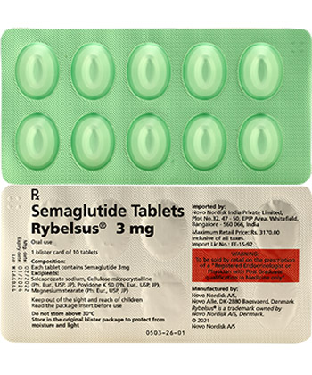 - Obvyklá dávka Rybelsus je 3 mg denně (první 30 dní), následně dávka 7 mg nebo 14 mg denně.